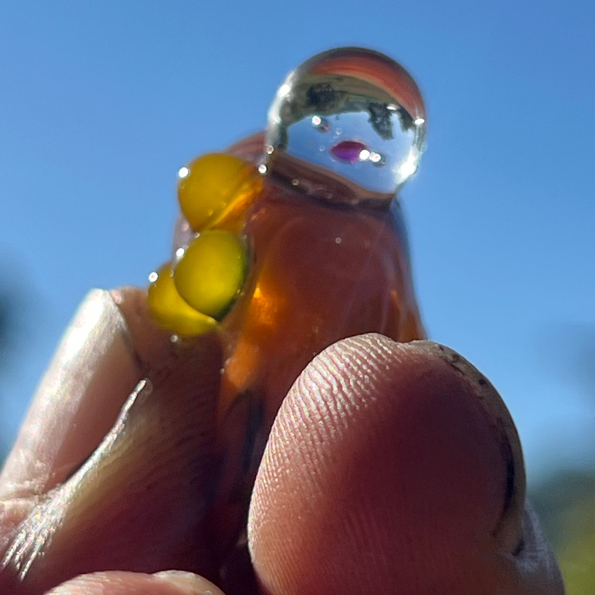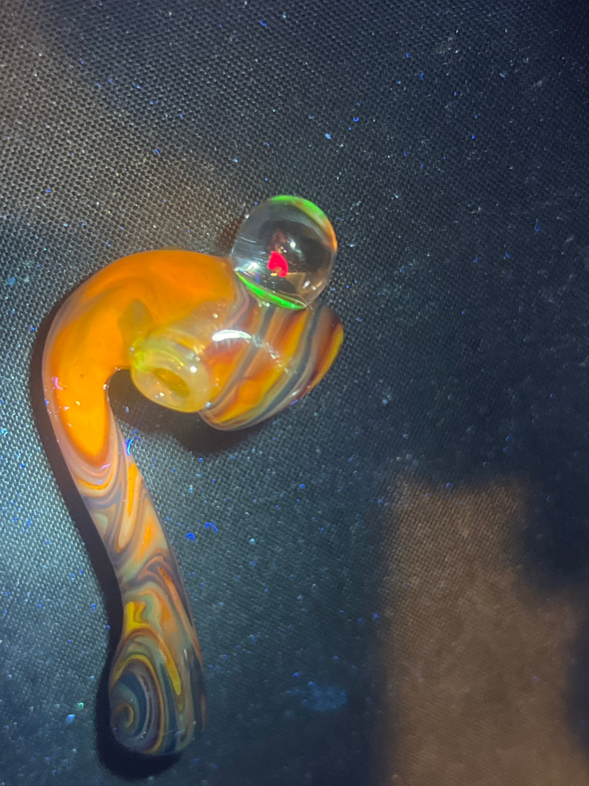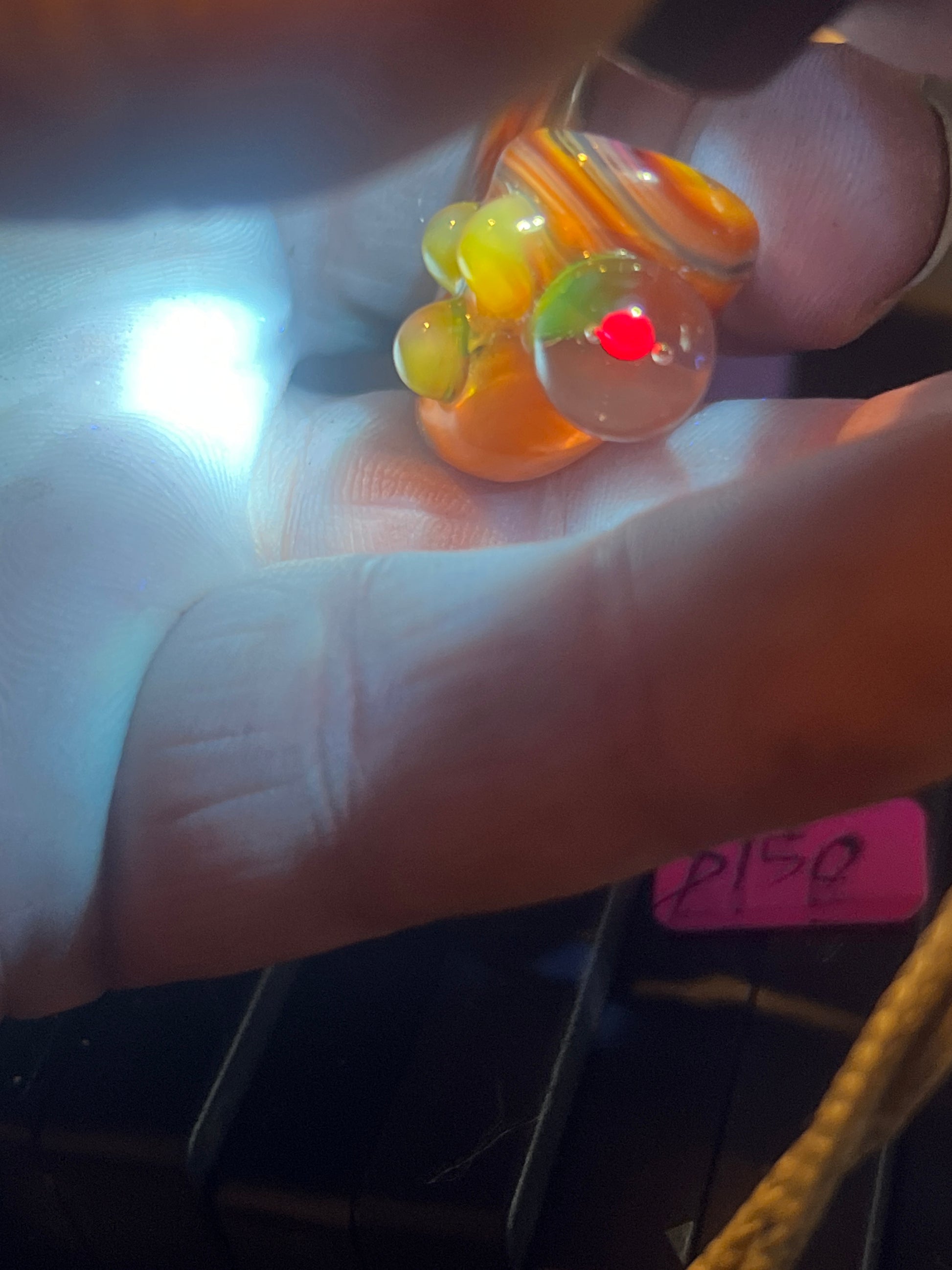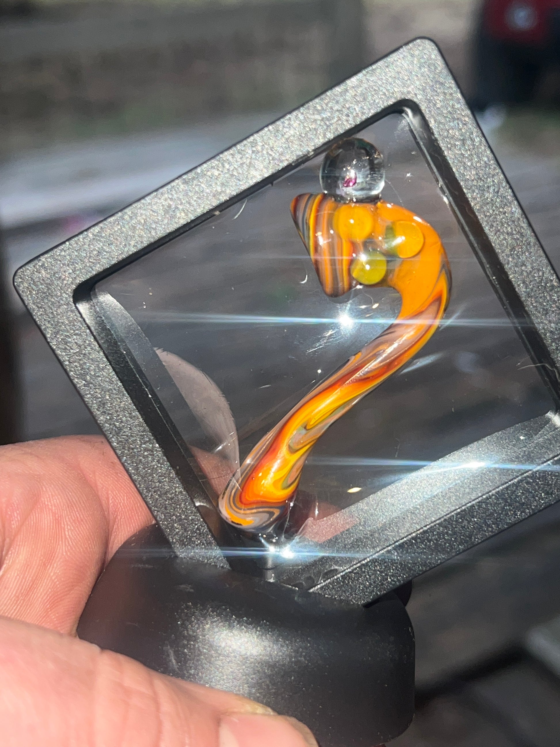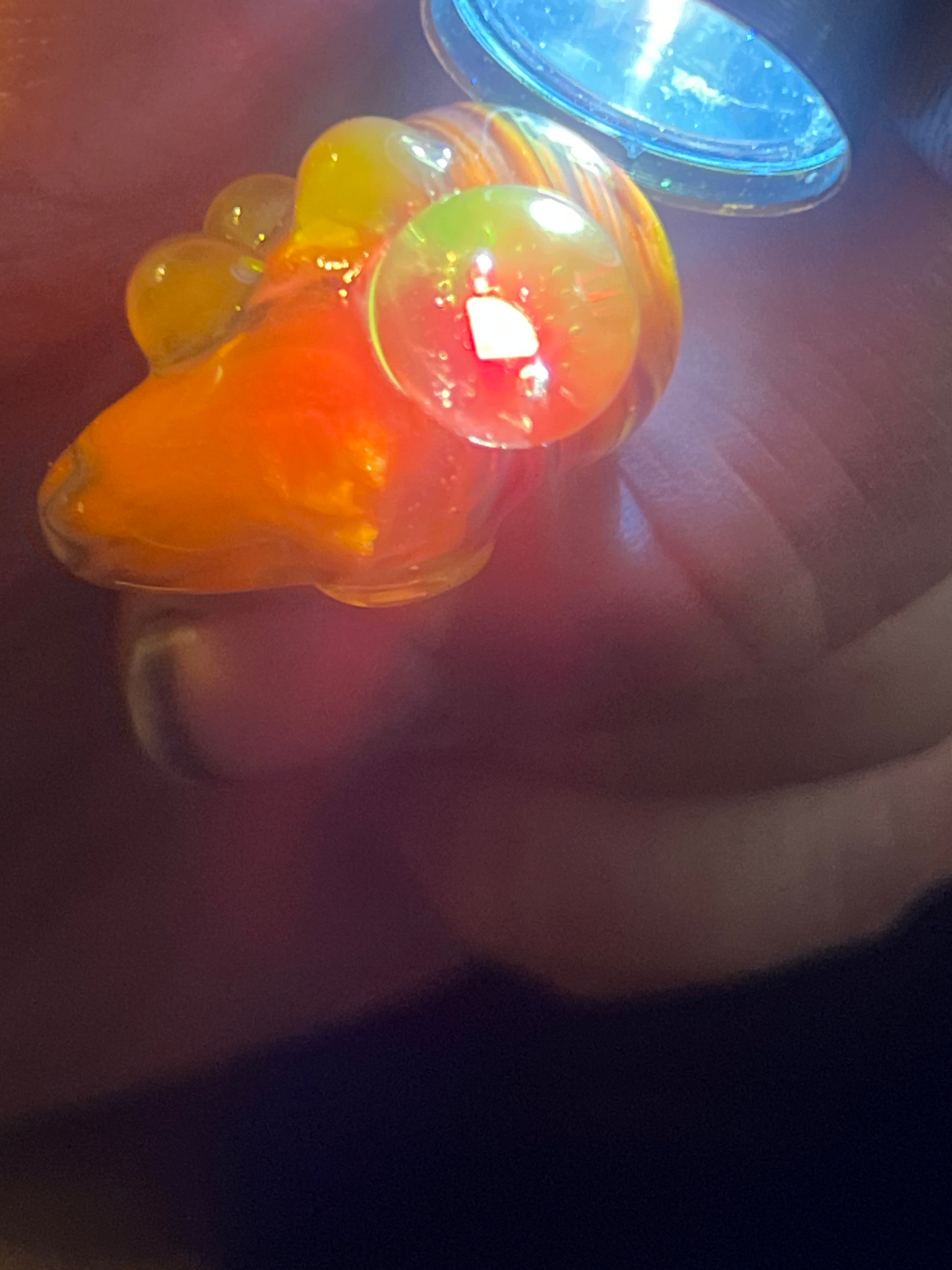 Beautiful vibrant colors on this mini Sherlock with 31 line rainbow line work over lava base. Features accent dots and raised carb in yellow opal and a lab created pink sapphire encased in clear glass backed by Illuminati. The gemstone glows a bright red under UV light and the Illuminati behind it glows green