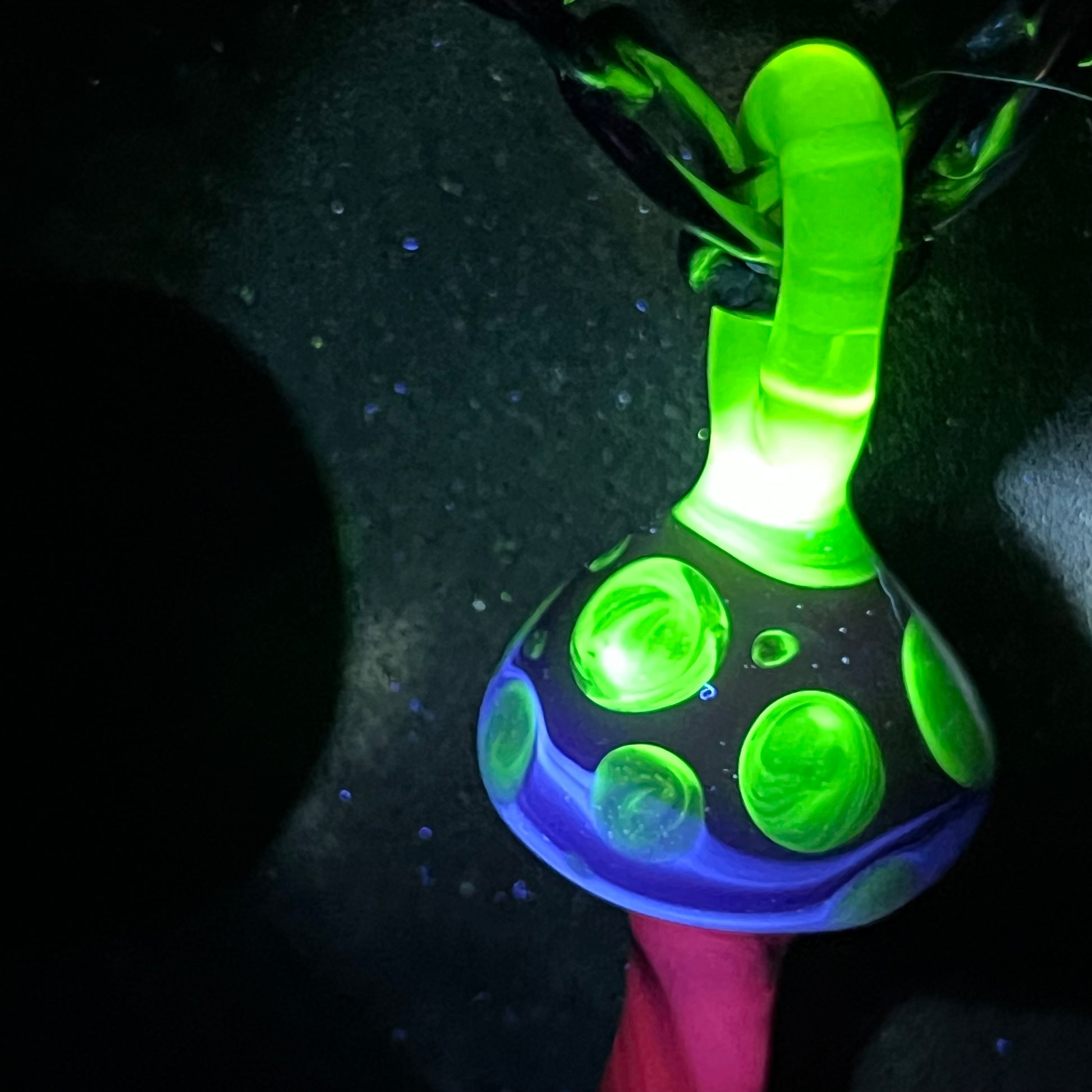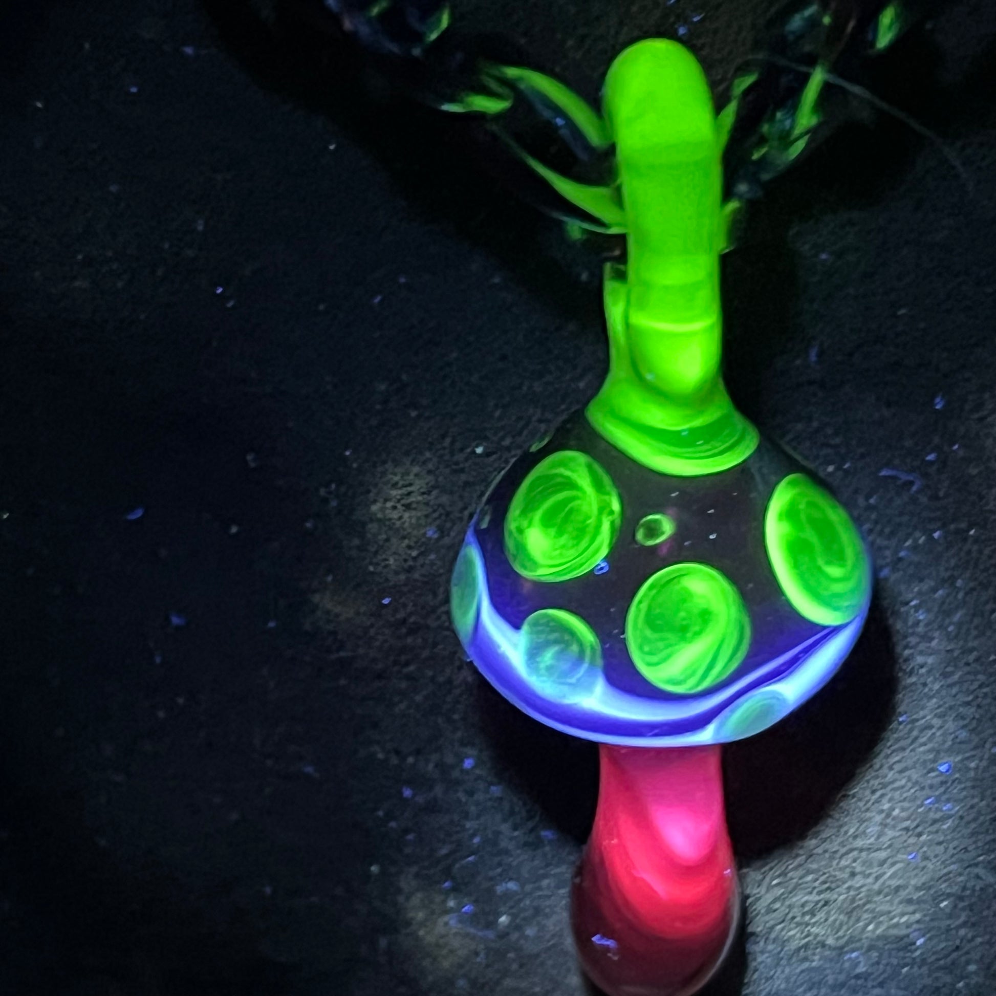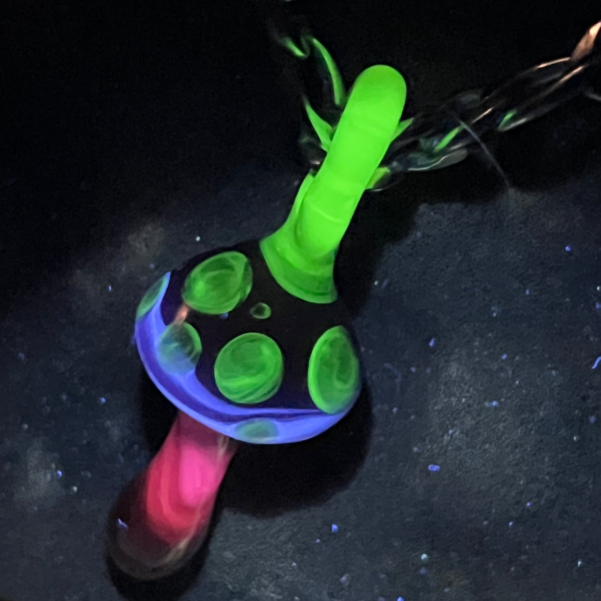 Indulge in the stunning beauty of our handcrafted Mushroom pendant. Made with vibrant borosilicate glass in Molten Aura Royal Jelly, Telemagenta, and Citrine, as well as Northstar glass in Lucy, Luna, and Dense Slyme from Troutman Art Glass. The encased white opal on the base of the stem adds a touch of elegance, making this pendant a true statement piece. 365nm-395nmUV light is recommended for best glow results.
