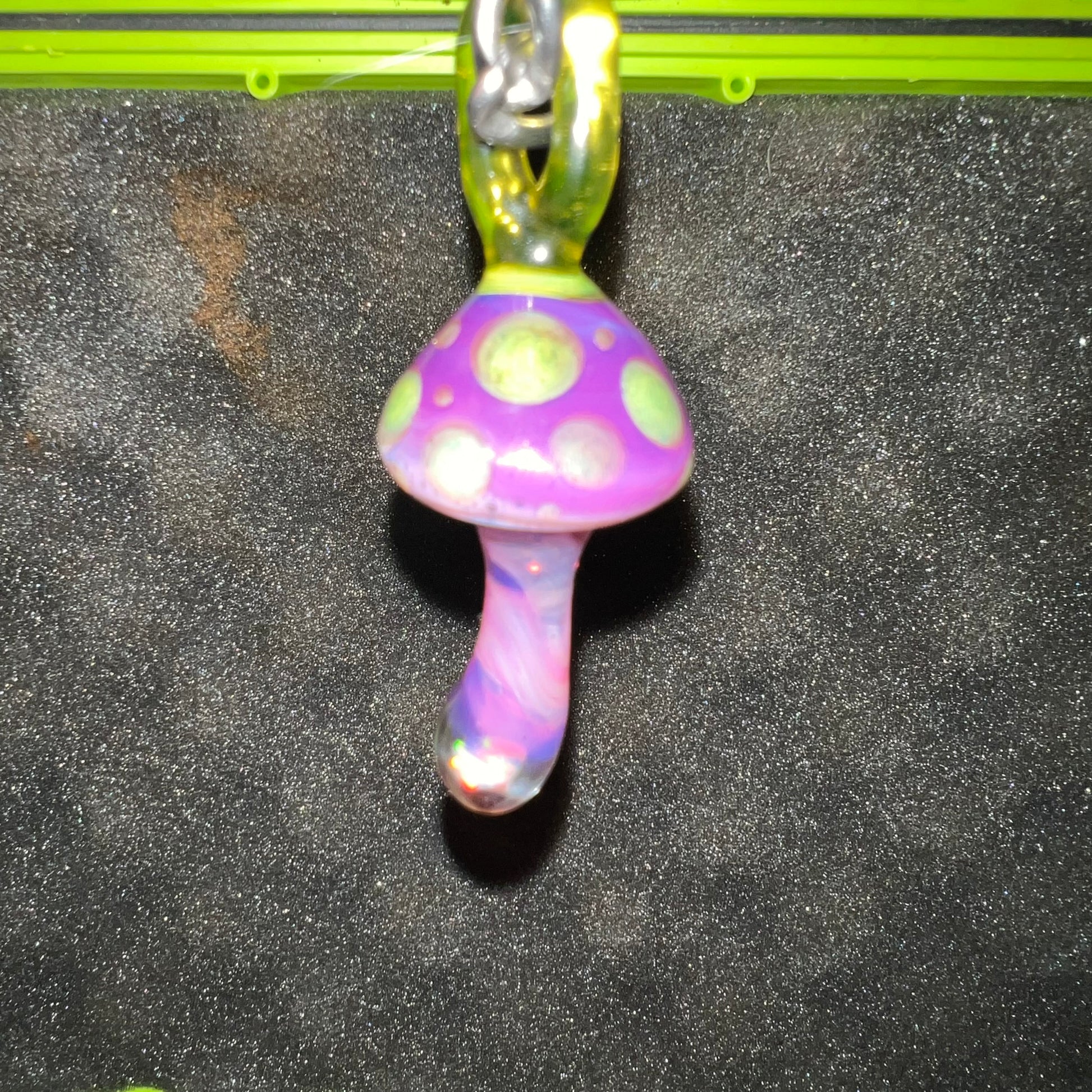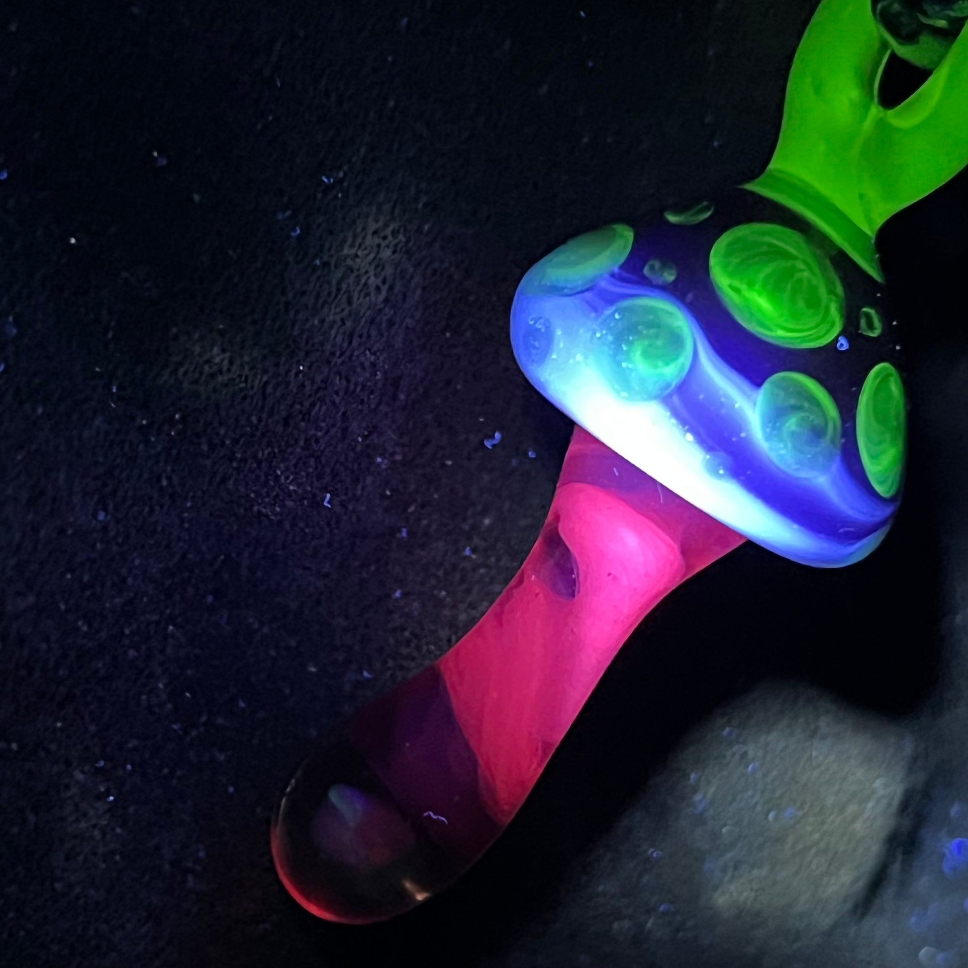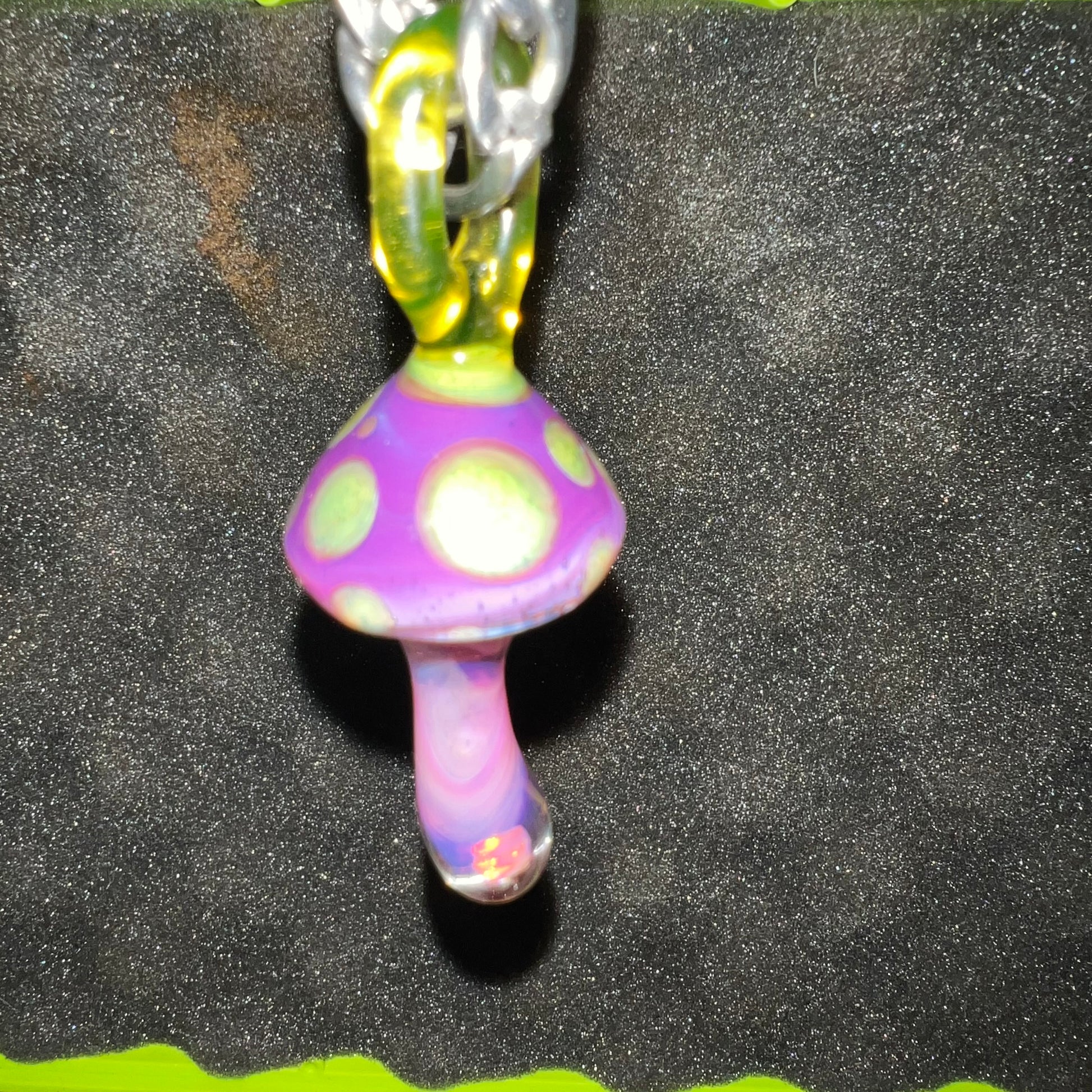 Indulge in the stunning beauty of our handcrafted Mushroom pendant. Made with vibrant borosilicate glass in Molten Aura Royal Jelly, Telemagenta, and Citrine, as well as Northstar glass in Lucy, Luna, and Dense Slyme from Troutman Art Glass. The encased white opal on the base of the stem adds a touch of elegance, making this pendant a true statement piece. 365nm-395nmUV light is recommended for best glow results.