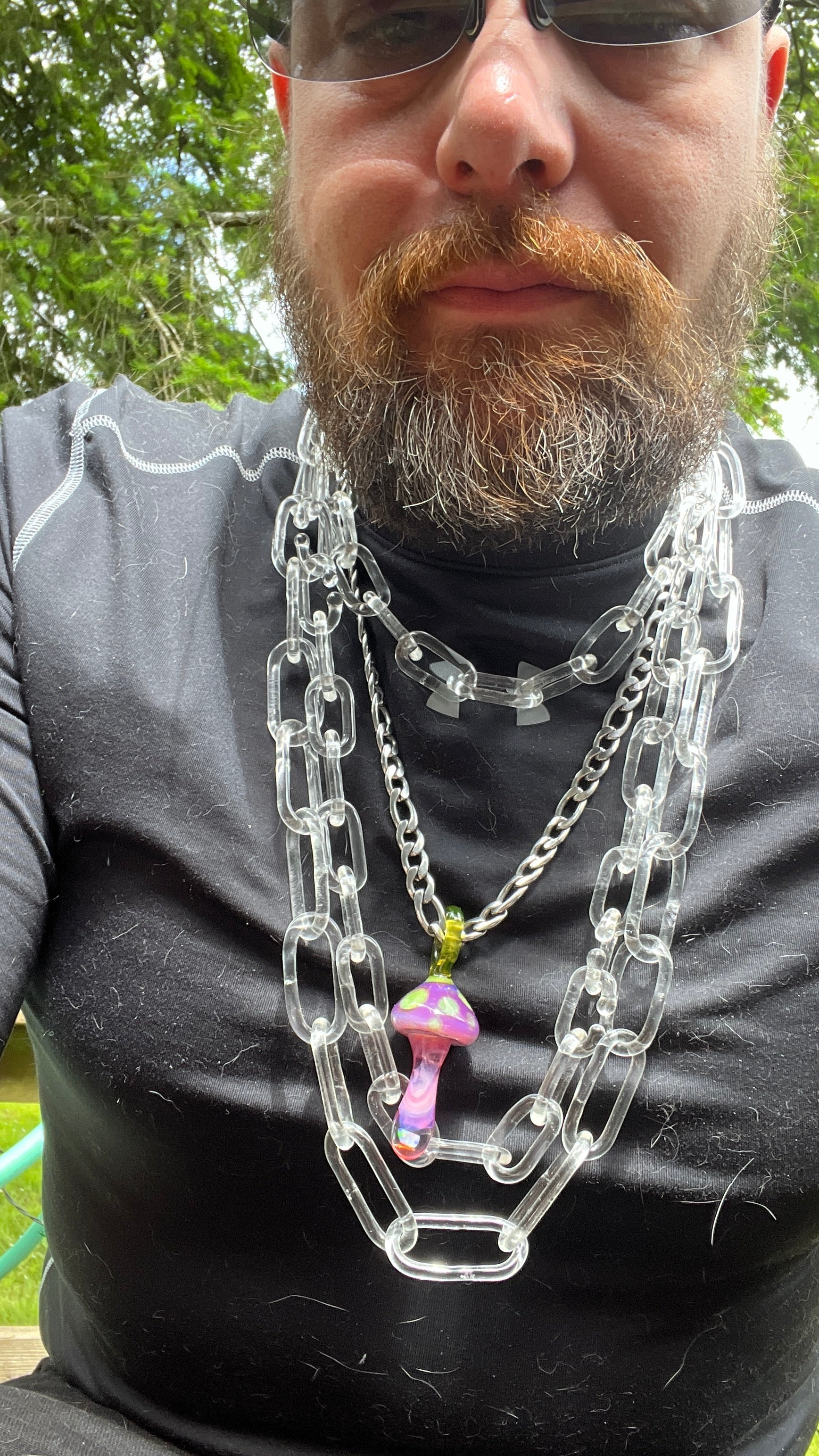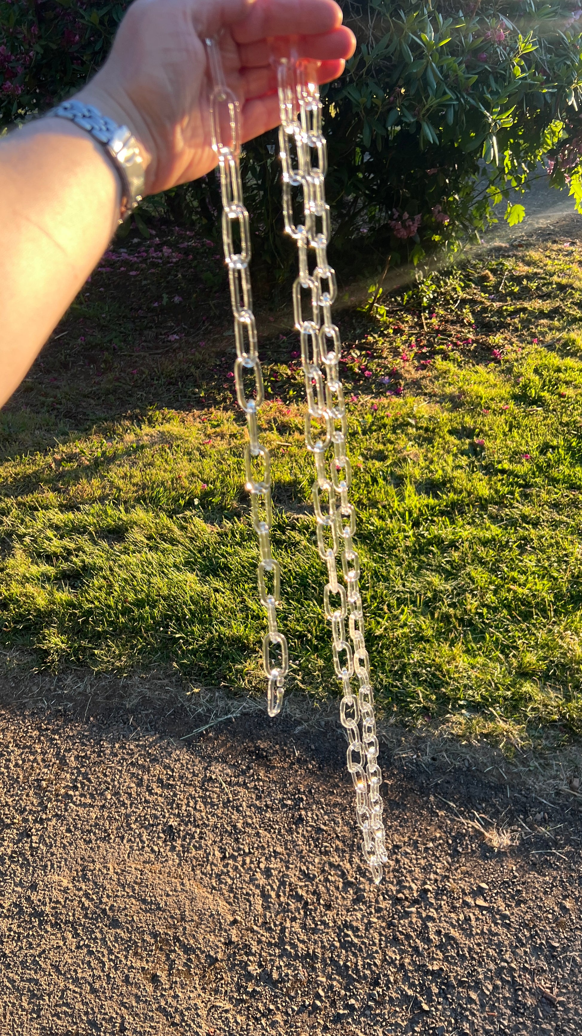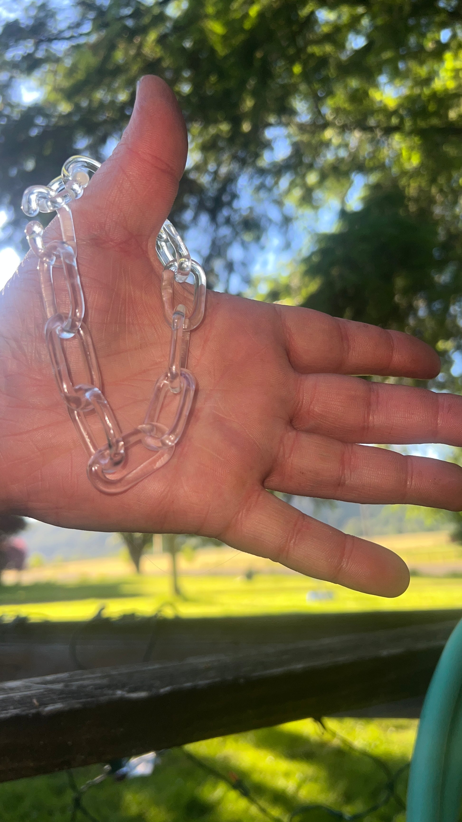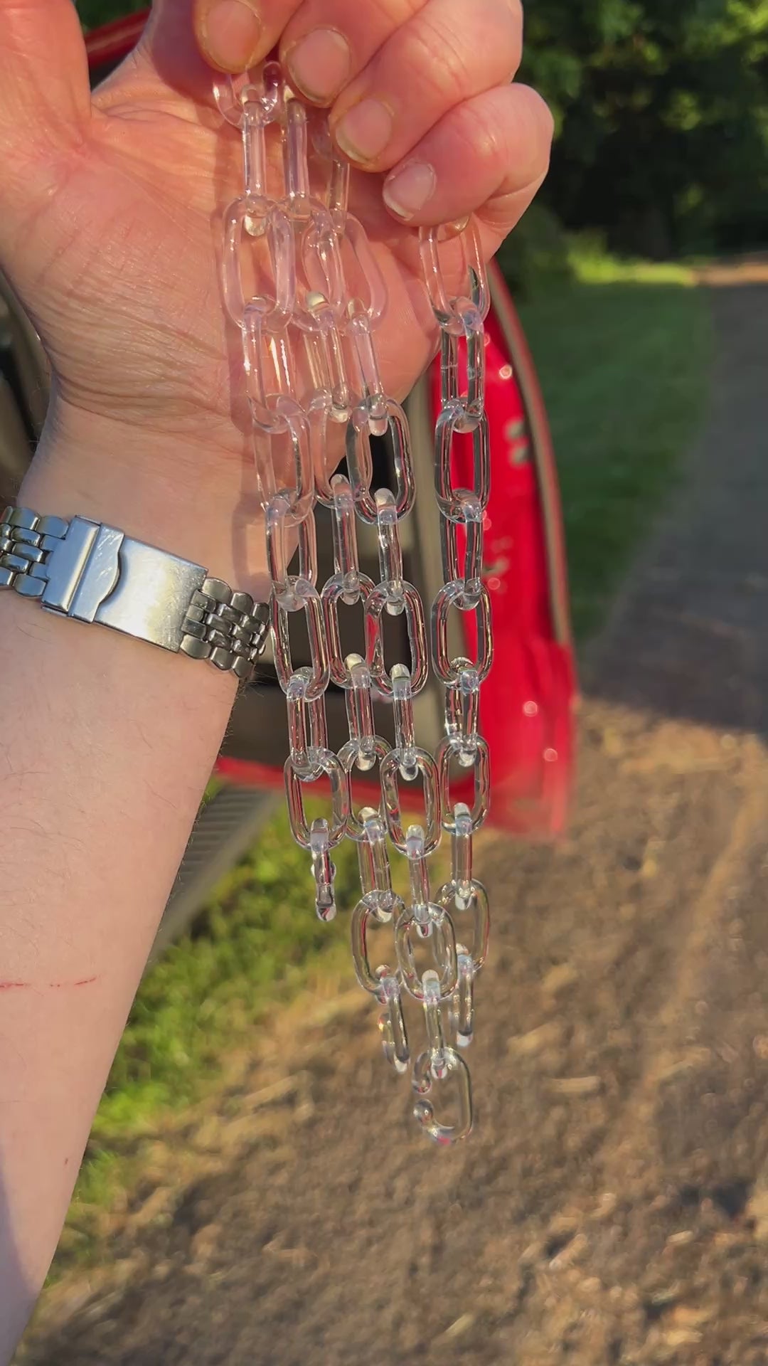 Custom glass chains for $5/link! Clear borosilicate glass chain made in 4mm links about an inch long and you can get any length you want for only $5 per link , clasp/connection links are the same size and price, if you prefer you can choose to not have connection links and the chain can be welded together so can only be taken on or off over the head. Multiple chains can link together if you choose so, you can have for example a bracelet and choker necklace that can also be a longer chain necklace with them connected. They also work great for pets to wear as a collar, and even a leash. Contact me for inquiries on other size links or colors if interested in something in a higher price range.
