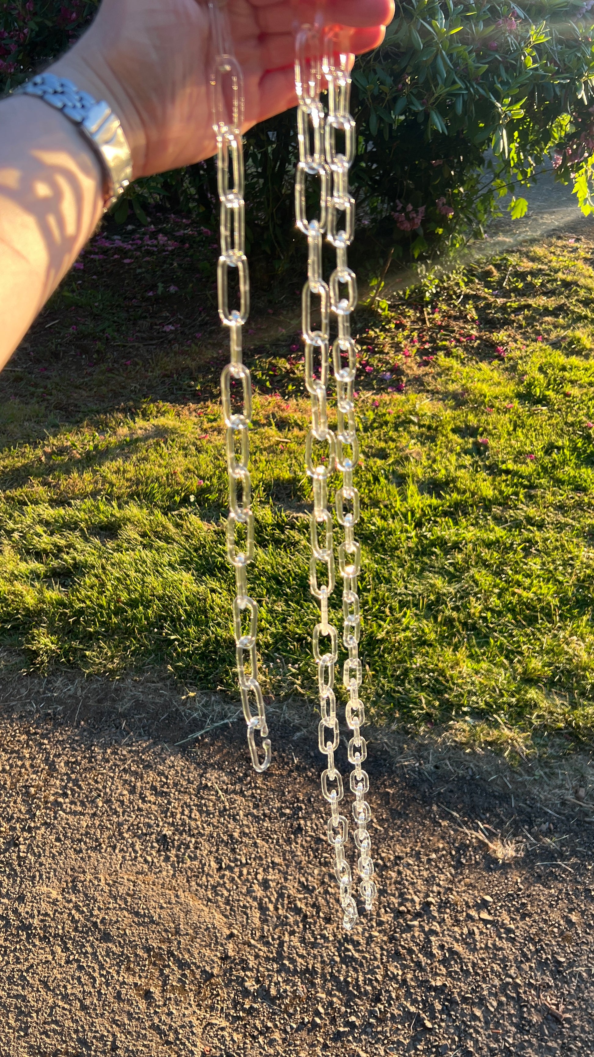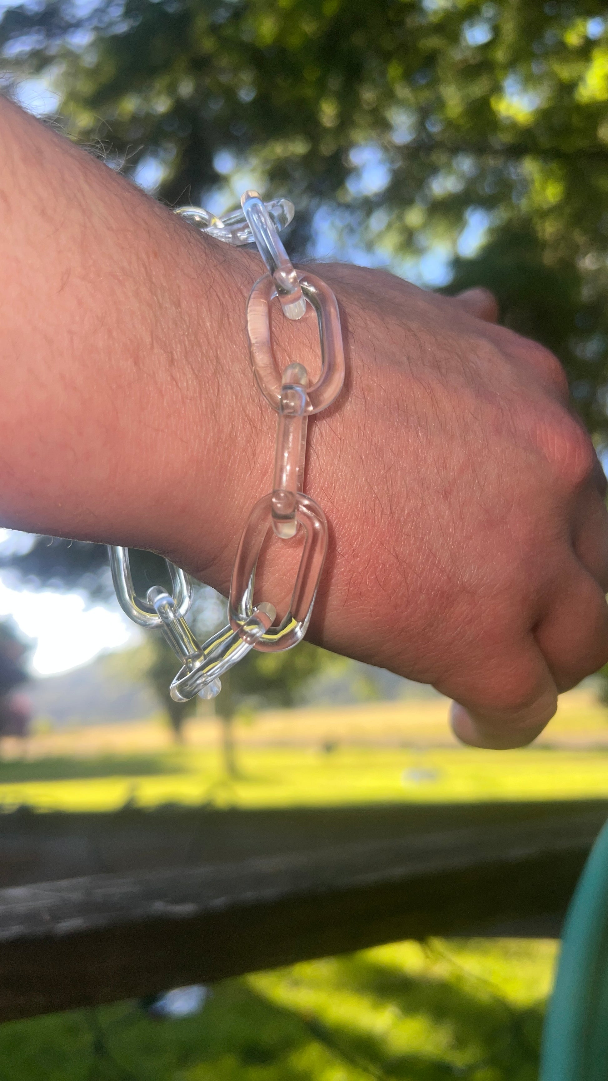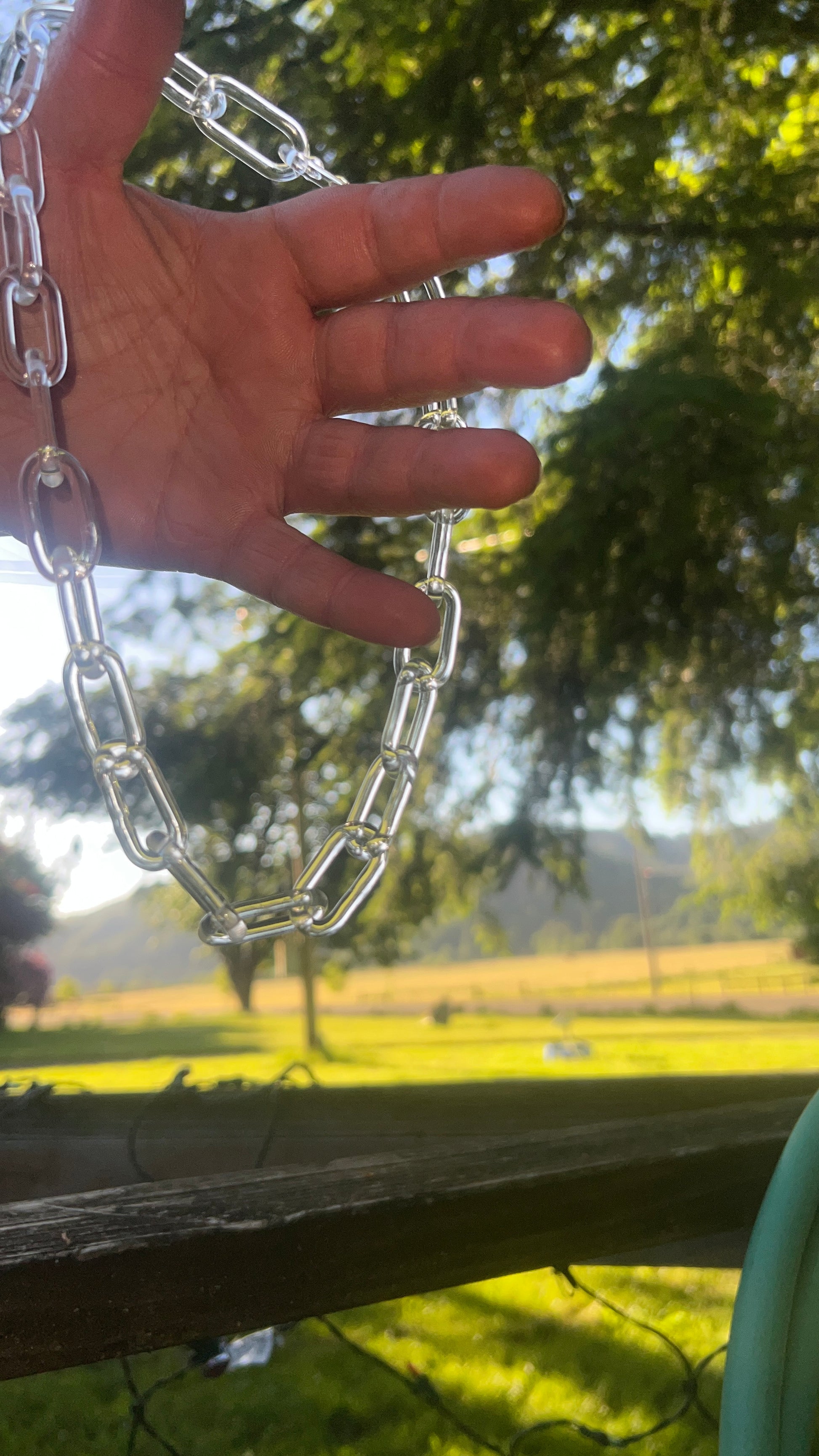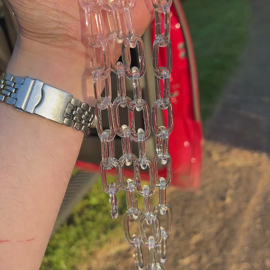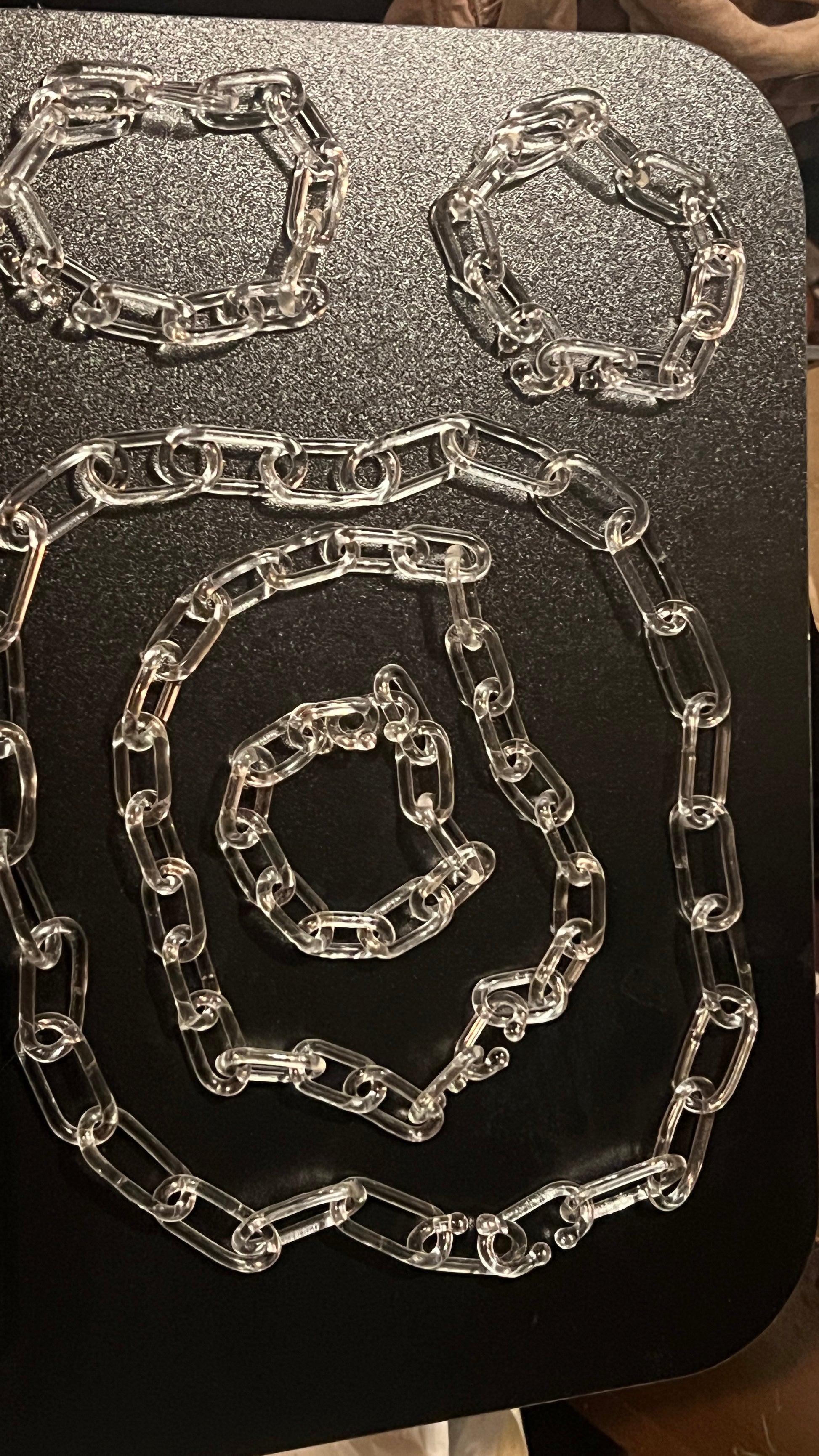 Custom glass chains for $5/link! Clear borosilicate glass chain made in 4mm links about an inch long and you can get any length you want for only $5 per link , clasp/connection links are the same size and price, if you prefer you can choose to not have connection links and the chain can be welded together so can only be taken on or off over the head. Multiple chains can link together if you choose so, you can have for example a bracelet and choker necklace that can also be a longer chain necklace with them connected. They also work great for pets to wear as a collar, and even a leash. Contact me for inquiries on other size links or colors if interested in something in a higher price range.